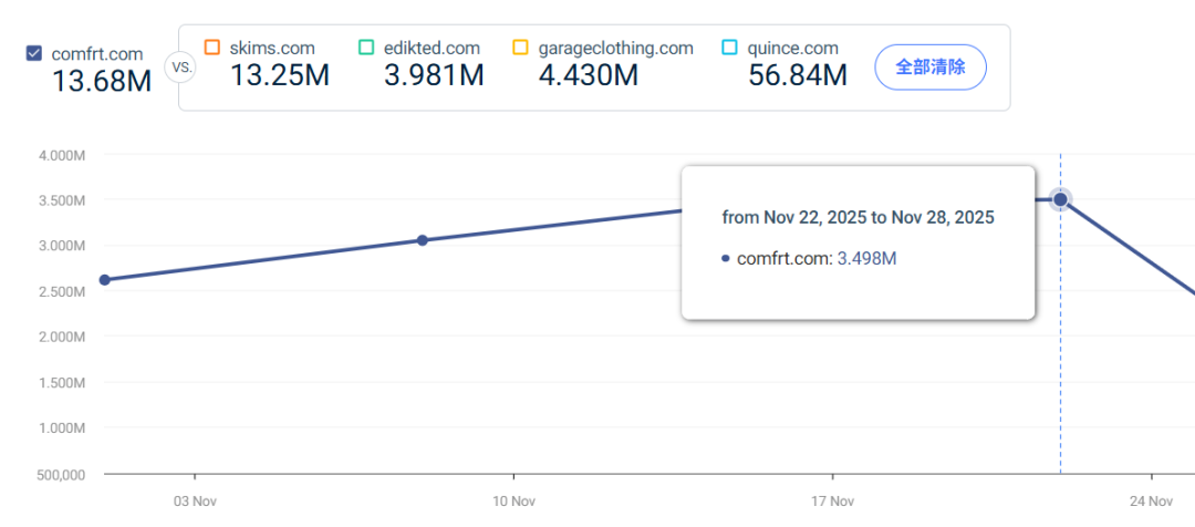 20%–35%,CTR(点击率) 也能明显更高,让“看起来不像广告的广告”成为推动品牌增长的真正引擎。 这种内容资产复用能力,让哈德森在采访时提到:“10 个真正用心的创作者,就能撑起每月 100 万美元销售额。”听起来夸张,但 Comfrt 的数据确实支撑得住。 而这些内容之所以能持续变现,并不是因为视频本身,而是因为 Comfrt 的独立站已经被打造成一个“高转化率的承接池”。用户从社交平台被种草后点进官网,首先看到的不是铺天盖地的促销,而是极简的落地页、统一的视觉语言,以及围绕“Comfort is a feeling”展开的情绪叙事,再配合大面积的用户真实评价,让“第一次下单”几乎不需要教育成本。 从Similarweb的数据显示, Comfrt 每月的访问用户已经超过千万,但更关键的是它的流量结构相对稳定。直接访问占了 40%,有机搜索 37.5%,说明用户不是被广告推进去的,而是主动回来找品牌的。 虽然社交媒体流量只有 16.5%,但质量极高,主要来自 Facebook、Instagram 和 Pinterest——正是这些平台,把那种“生活感强、不油腻”的内容推成了增量来源。 图源:similarweb 更重要的是,用户 98.7% 来自美国,而且还在持续上涨。这说明 Comfrt 的品牌心智已经在北美站稳了,复购和口碑开始自循环。在独立站端,Comfrt 没有走传统 DTC 那种“狂砸广告 → 冲 GMV”的套路,而是做了一个非常完整的内容闭环: 好产品 → 用户内容 → 多平台放大 → 主动搜索 → 回流独立站。 消费者不是看完广告就下单,而是被随手内容吸引进来,再因为那种“裹着毯子一样的舒适感”留下来,最后又成为下一轮内容的真实素材。 简单说,内容不是“造出来的”,而是“被生活挖出来的”。当这四个轮子一起转——产品、内容、情绪价值、独立站沉淀——Comfrt 爆红就成了顺理成章的事。 现在品牌单月销售峰值已经做到 4700 万美元,2025 年 11 月很可能突破 1 亿美元。接下来 Comfrt 也在往睡衣、休闲运动等更多生活场景扩展,让“舒适”变成一种可穿、可晒、可复购的生活方式。 某种意义上,Comfrt 的打法已经不是“卖卫衣”了,而是在做一个能长期占据用户心智的品牌模型。这也是这两年 DTC 领域值得借鉴的案例之一。