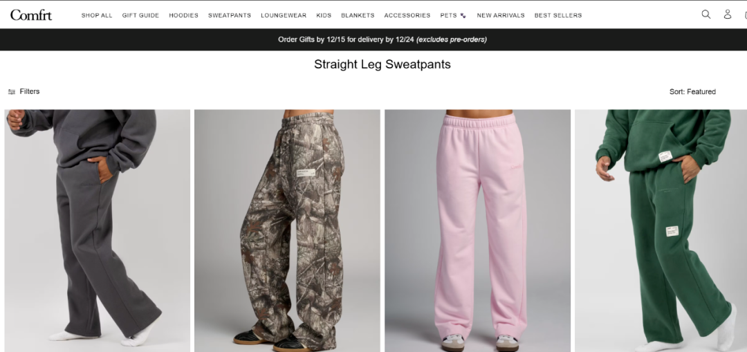 心理健康”这条情绪价值主线,让消费者感到这不仅是衣服,更是一种态度。产品线主要围绕连帽衫、运动裤、家居服展开,如今也延伸至儿童、宠物、毯子等产品。 图源:comfrt独立站 品牌Comfrt的建立源于 2022 年 8 月的一个偶然。他在 GoDaddy 上看到一个少了字母 O 的独特域名“Comfrt”,于是花 5000 美元直接买下,最终成为了品牌名。当时他甚至没有明确产品规划,但他非常确定:自己未来想做的,是一个能承载情绪价值的品牌。 基于自身过往的心理困境,他刻意将