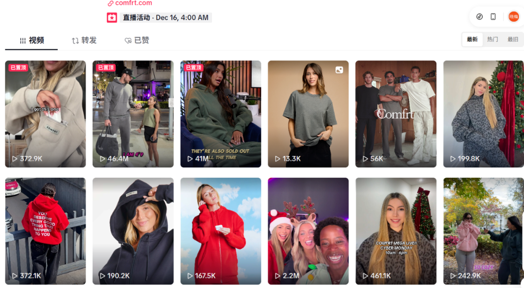 2022 年上线首周,在只动员了 30–40 位普通创作者的情况下,就卖出 10 万美元、直接清空八成库存。 图源:comfrt独立站 而真正让 Comfrt 爆红的核心原因之一,除了品牌理念之外,是他们把普通人的内容规模化生产出来的能力。 哈德森并不依靠明星代言,而是把全部预算压在微影响者身上:那些粉丝不多、但生活气息强、表达自然的创作者。这些合作的KOL每月稳定产出约 30 条内容,从开箱、日常 vlog,到“裹着卫衣坐在沙发发呆”都能成为品牌传播点。 例如,一位在纽约念书的女大学生在赶论文 vlog 里随手拍到自己裹着 Comfrt 的卫衣,视频原本只有几万播放,却因为“深夜赶 due 的真实感”被品牌二次剪辑、投放后带来上万次站点访问; 一位远程办公的上班族拍“WFH一周穿搭”,结果