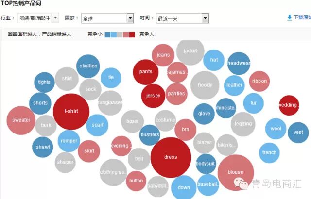 行业下TOP国家最近一段时间TOP热搜的品类,圆圈越大,热搜量越大。